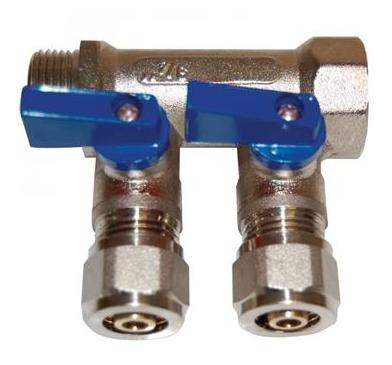 Fordelerrør med afspærring og 2 afgange Med løs støttebøsning til 15mm pex rør og 1/2 gevind.