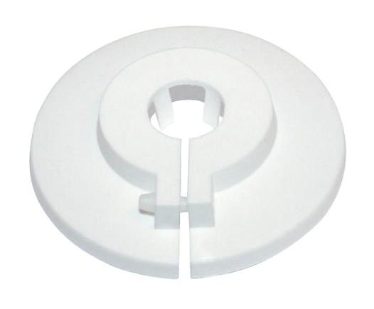 Stuer todelt Plastroset. Rosetten monteres når rørinstallationen er færdig. Rosetten vrides om røret og klemmes sammen uden lim.
