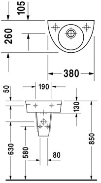 Duravit Starck 2 håndvask 38 cm - Med/uden hanehul På denne vask er der forlokkede hanehuller i både venstre og højre side. Forlokket betyder at hullet er forberedt, men man skal selv slå det ud.