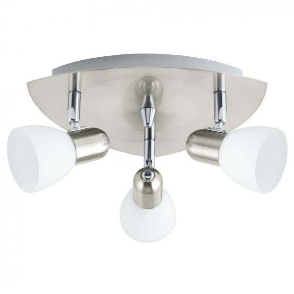 rondel i børstet stål med satineret hvide glasskærme, 3L. Højde 7 cm, Diameter 50 cm. E14, max. 3 x 40 watt. Leveres ekskl. lyskilder. IP20.