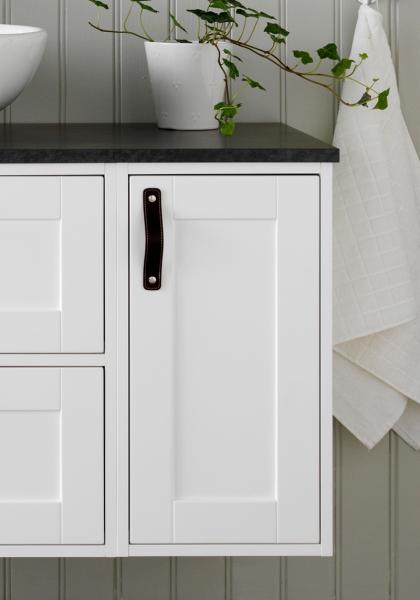 Hafa Eden er et klassisk designet møbel med velforarbejdede detaljer. Skabet til håndvasken kan kombineres på forskellige måder og med forskellige håndtag. Alle skuffer og låger har dæmpet lukkefunktion. Skufferne kan trækkes helt ud, hvilket gør indholdet lettilgængeligt. Vælg mellem en fritstående porcelænshåndvask på en bordplade eller en nedsænket porcelænshåndvask. Fås med flere forskellige spejloverdele og spejlskabe med LED-belysning både over spejlet og ned mod håndvasken.