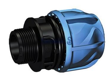 Overgangsnippel i PP. Montage uden adskillelse. Passer til alle PE-rør. Pakning: NBR (PTFE-coatet) kvalitet til drikkevand. Udvendig gevind ISO 7 (konisk). Blå omløber og sort krop.