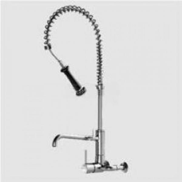 Storkøkkenarmatur i krom med montering i væg. Armaturet er udstyret med et greb samt omskifter mellem tuden og håndtaget.