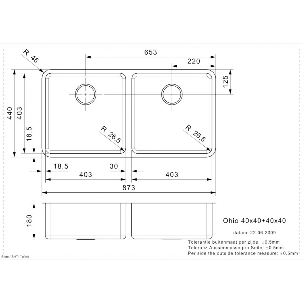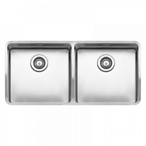 Dobbelt stålvask, der kan monteres på forskellige måder: almindelig nedfældning, underlimning og planlimning.