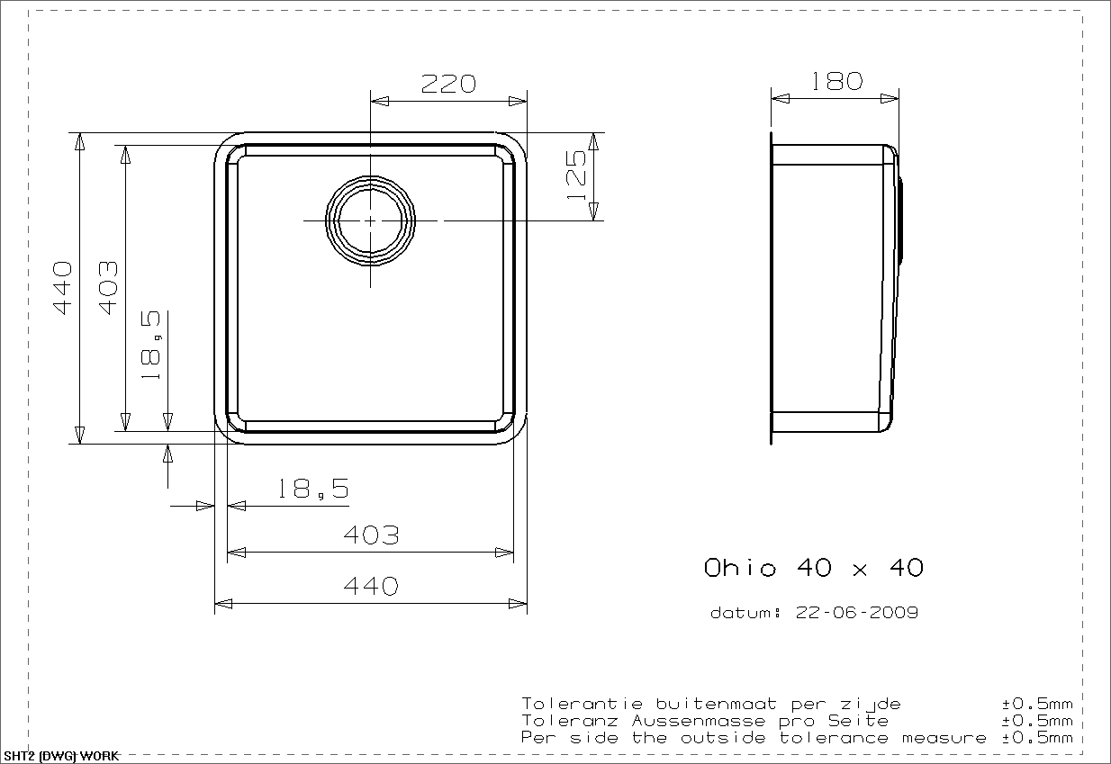 Kummemål: 403 x 403 x 180 mm