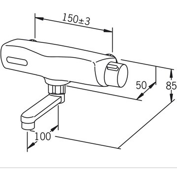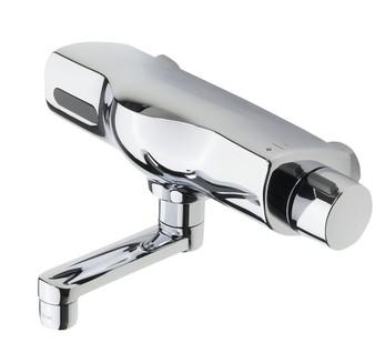 Berøringsfri vægbatteri med svingtud og luftblander med vandbegrænser 6 l/min. og temperatur regulering. Temperatur grebet er udstyret med skoldningsspærre, der kan overskrides ved at trykke knappen ned. Tud længde.: 100 mm.  |
