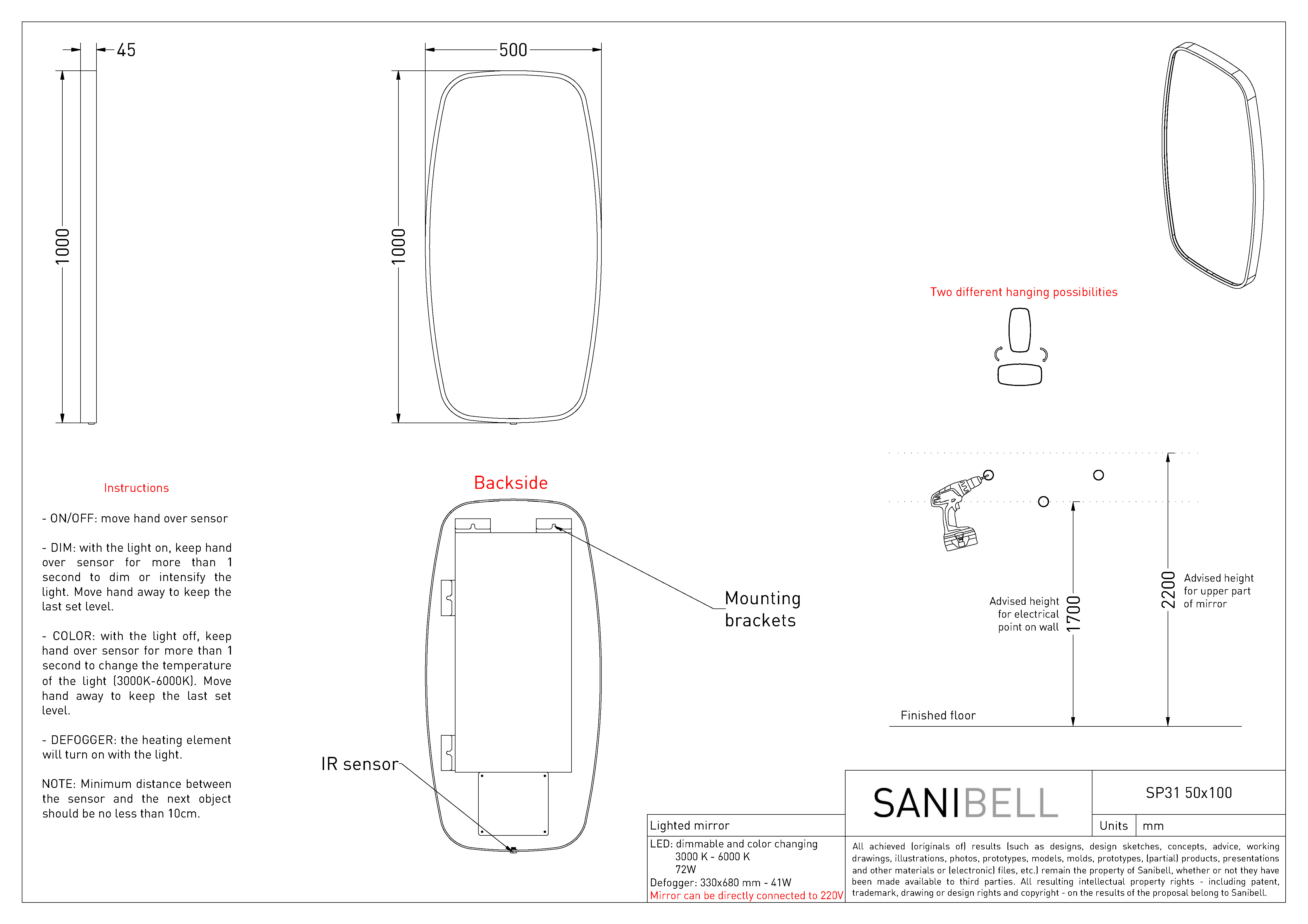 Sanibell Ink SP31 spejl m/lys, varme og sensor 50 x 100 cm - Mat hvid