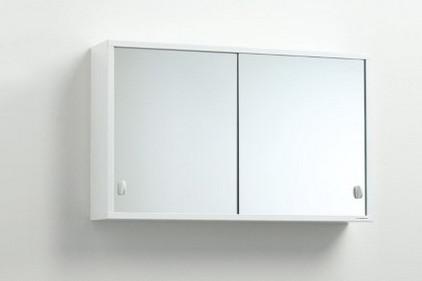 Spejlskab i metal med skydelåger i spejlglas og håndtag. Tvilling har to flytbare hylder i lakeret metalplade. Spejlskabet er fremstillet af metalplader i en zink-jernlegering, som giver glimrende bestandighed mod korrosion og rust. Badeværelseskabet er pulverlakeret, hvilket giver en god ridsebestandighed.