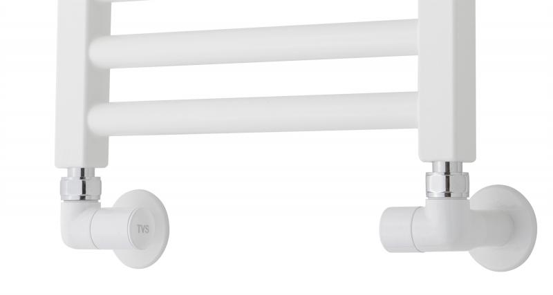 TVS ventilsæt type 150, vinkelløbende, vendbar - Hvid Manuel ventilsæt type 150 er et vinkelventilsæt som bruges når man skal have sin håndklædetørrer monteret på central- / fjernvarmesystemet. Brugen af denne type ventil kræver at der afsat 2 indmuringsdåser i væggen med samme centerafstand som radiatoren. Man vil typisk bruge denne type ventil hvis man ønsker en løsning der ikke fylder meget og hvor der ikke skal reguleres på varmen jævnligt. Da reguleringen er manuel og ikke termostatstyret vil ventilen være meget følsom og der skal ikke skrues ret meget på ventilhovedet for at stille temperaturen. Ønsker men en ventil med termostat skal man vælge type 120, 121, 220 eller 221 i stedet for fra TVS Specifikationer: