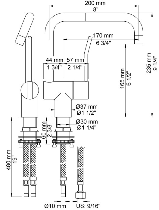Et-grebsblander med langt greb og keramiske ventilenhed, 360° dobbelt svingbar tud. Vandbesparende luftindblander. Specifikationer: